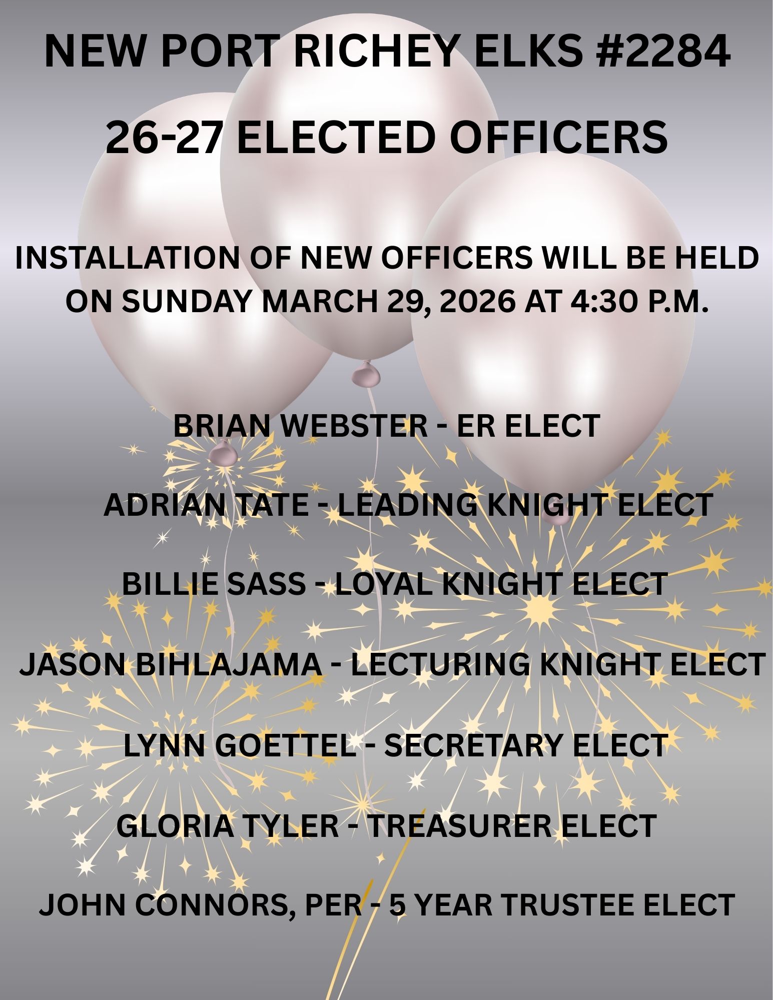 This website is operated and maintained by Benevolent and Protective Order of Elks, New Port Richey Lodge 2284 Inc. as a 501(c)8 with the IRS and is governed by its Terms of Service and Privacy Policy.